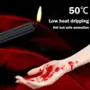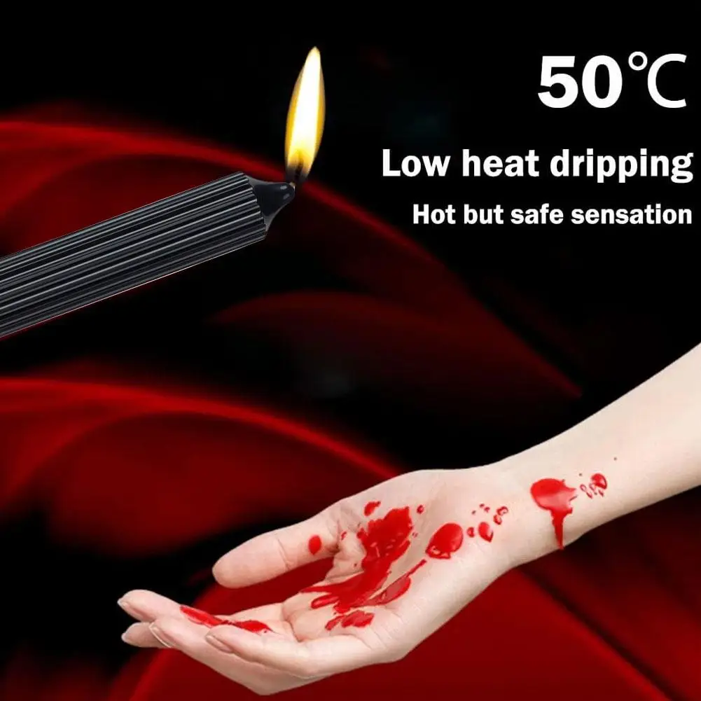 Tilt the candle and drip from 30cm+ height for lower heat. Adjust distance/angle to vary intensity. Avoid sensitive areas (eyes, genitals) and hair.