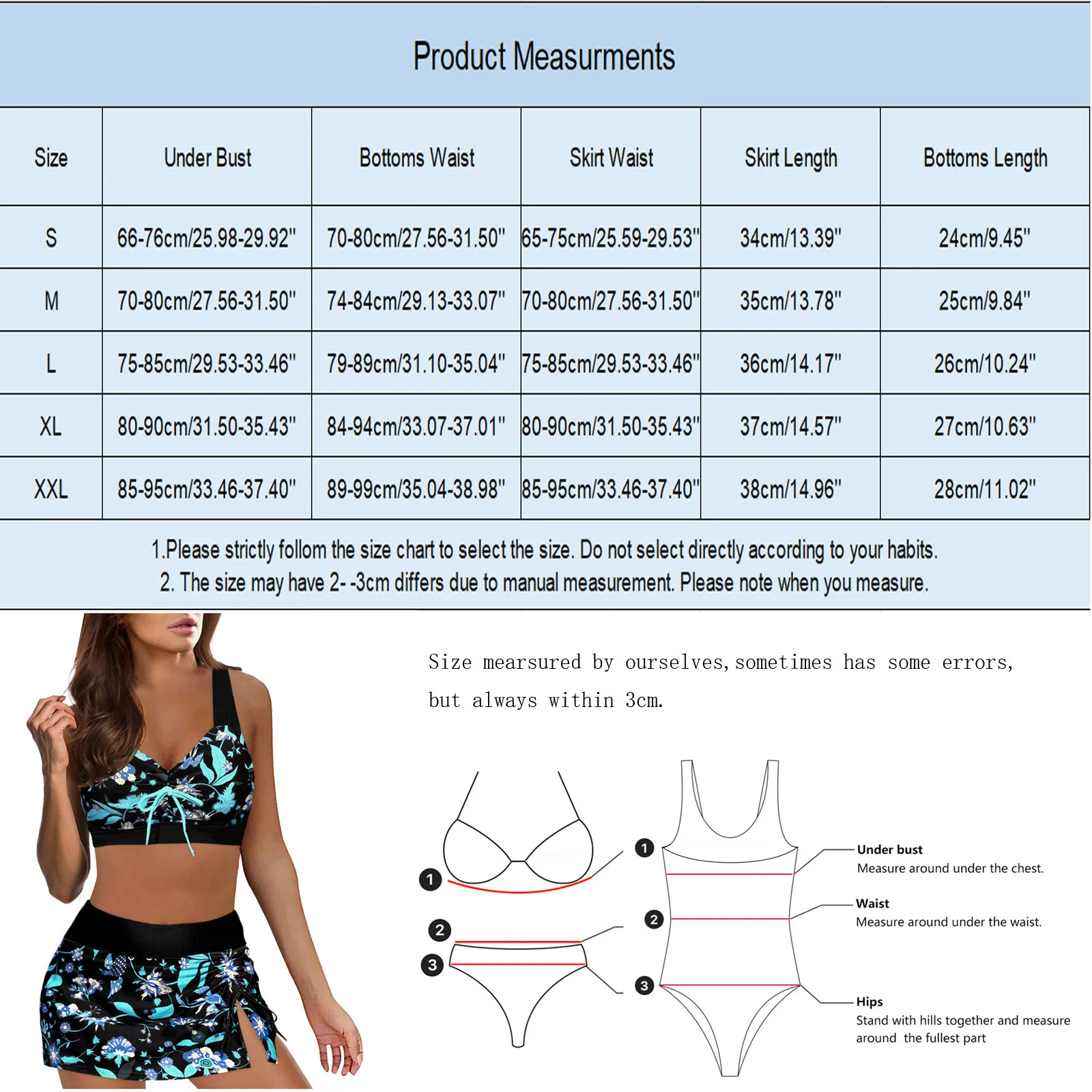 | Size:L | Bottoms Waist:79-89cm/31.10-35.04” | Skirt Waist:75-85cm/29.53-33.46” | Skirt Length:36cm/14.17” | Bottoms Length:26cm/10.24” | Under Bust:75-85cm/29.53-33.46” |